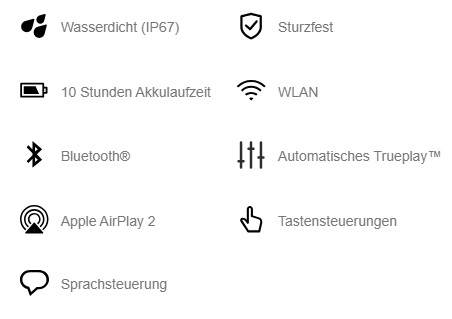 Konnektivität | WLAN Verbindet sich über WLAN mit jedem 802.11a/b/g/n/ac-Router im 2,4- oder 5-GHz-Bereich. Bluetooth Bluetooth 5.2 unterstützt Audio-Streaming von deinem Bluetooth-fähigen Gerät. Akku Der 18-Wh-Akku bietet mit nur einer Akkuladung bis zu 10 Stunden lang ununterbrochen Sound bei mittlerer Lautstärke. Laden Nutze das mitgelieferte USB-C-Ladekabel mit einem kompatiblen USB-C-Netzteil (nicht im Lieferumfang enthalten). Du kannst auch das kabellose Ladegerät des Sonos Roam oder ein kabelloses, Qi-zertifiziertes Ladegerät verwenden. USB-C-Port 15 W, 5 V/3 A Apple AirPlay 2 Funktioniert mit AirPlay 2 auf Apple Geräten ab iOS 11.4 über WLAN |